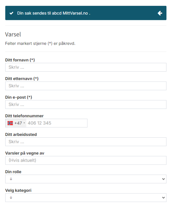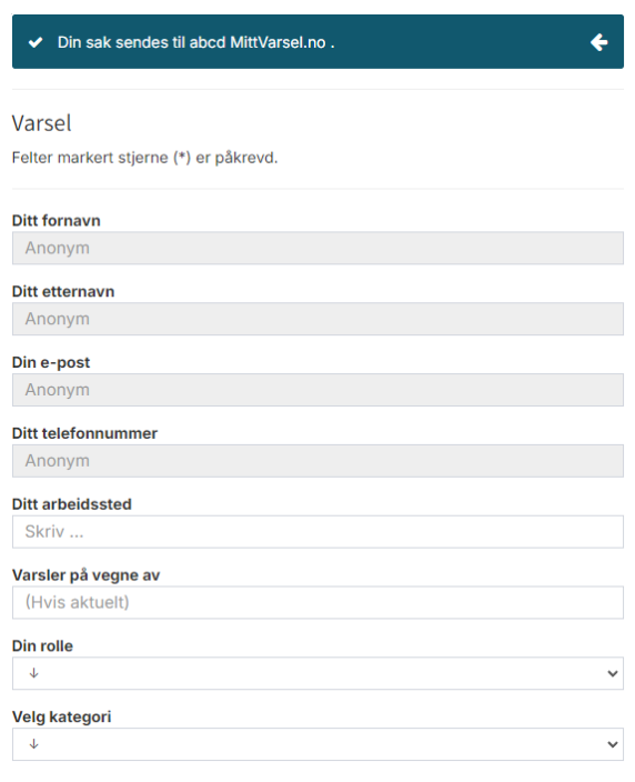 Den eneste forskjellen mellom å varsle med navn og å varsle anonymt, er at kontaktinformasjonsfeltene automatisk fylles ut med «Anonym». Når du varsler anonymt, er det derfor ikke mulig å skrive inn egne opplysninger i disse feltene. Kun felt som er merket med (*) må fylles ut.