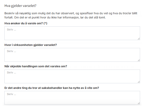 Her må du fylle ut kontaktinformasjon som navn, e-post og mobilnummer. Videre består skjemaet av ulike spørsmål. Det kan være greit å fylle ut så mye informasjon som mulig, da det gjør det enklere for saksbehandleren å behandle saken. Kun felt som er markert med (*) må fylles ut.