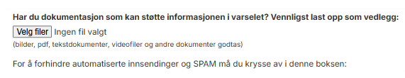 Dersom du har noen filer du ønsker å legge ved, kan du laste opp disse. Trykk på “Velg filer”, og legg til ønsket fil. Filen blir lagt til varslingsskjemaet du sender inn.