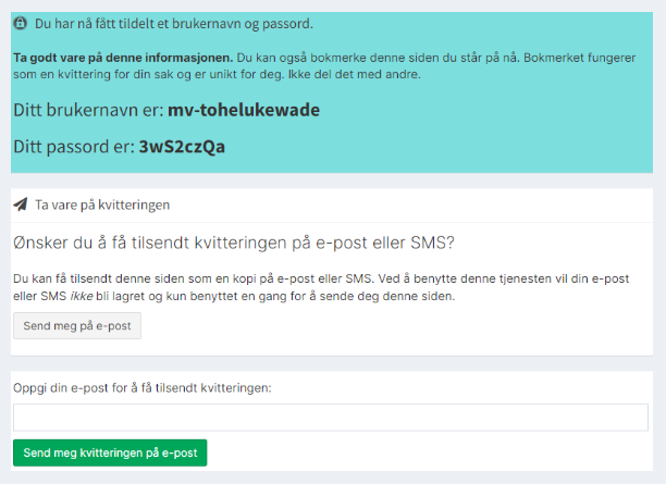 Dersom du ønsker kan du få brukernavn og passord tilsendt den på e-post, ved å trykke på “send meg på e-post” og oppgi e-postadressen du ønsker å få tilsendt kvitteringen til.