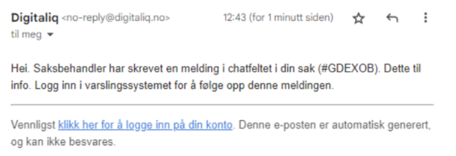 Dersom saksbehandler sender deg en melding i portalen, vil du som anonym varsler ikke motta noe varsel om dette. Det er derfor viktig at du logger deg inn jevnlig for å sjekke om det har kommet nye meldinger.