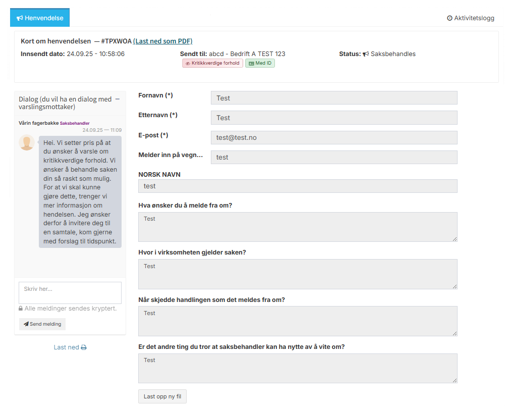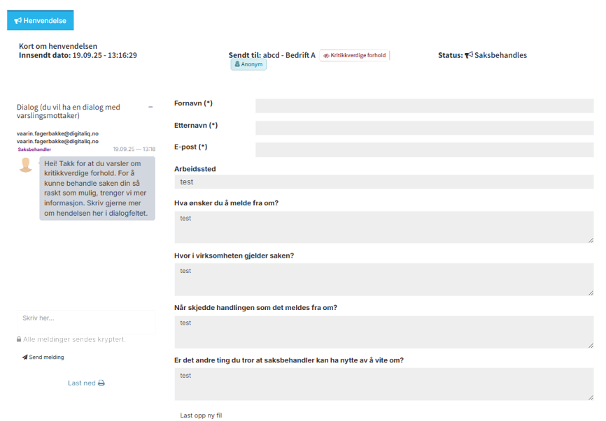Når du logger inn i portalen, kan du se saken du har sendt inn. På venstre side finner du en dialogfunksjon der du kan kommunisere direkte med saksbehandler.