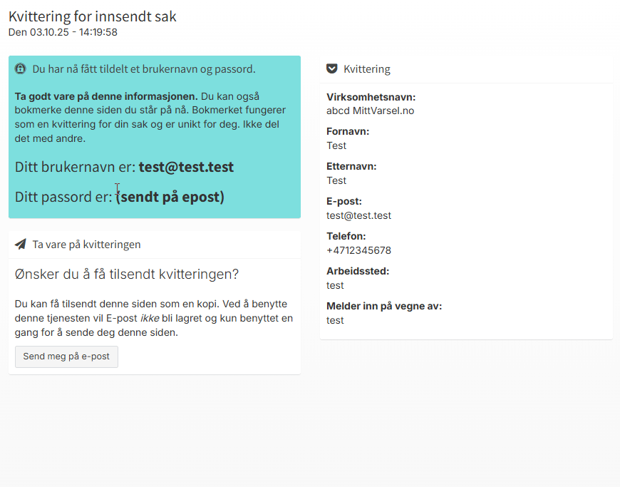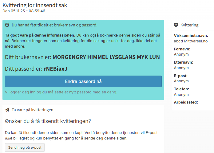 Dersom du varslet anonymt vil du se brukernavn og passord direkte i nettleseren.