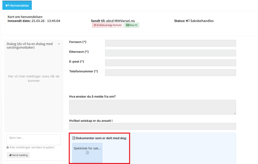 Under «Mine saker» finner du varslingssaken din. Når du klikker deg inn der, åpnes saken din.