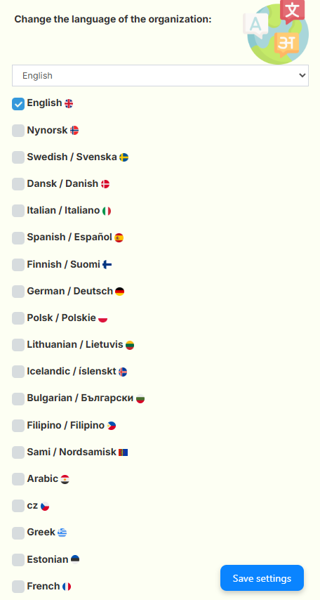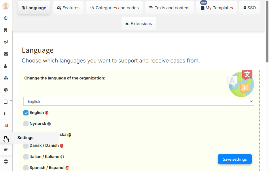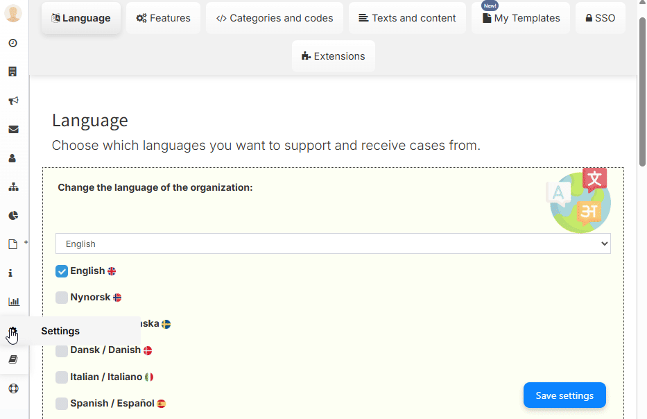You can activate the desired language for the portal, allowing you to tailor the whistleblowing portal to users’ needs. This ensures the whistle-blower sees all information in their preferred language.