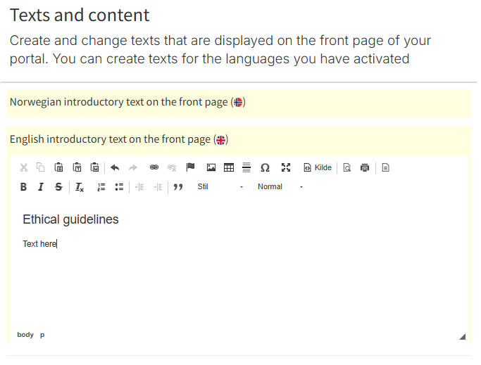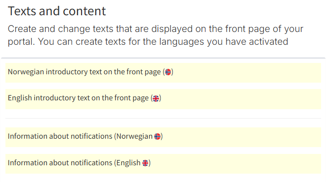 Under Text and Content, you can create and edit the content displayed on your portal’s front page. You can also add texts for the languages you have activated.
