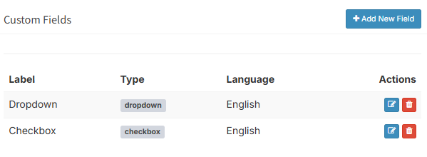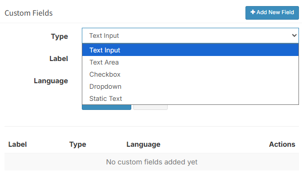 You can also add custom fields by clicking “Add New Field”. This allows you to choose the type from a dropdown menu, enter a label, and then select the language. To display the field on your portal’s front page, click “’Save Field”. All the fields you create will be collected under the section for custom fields.