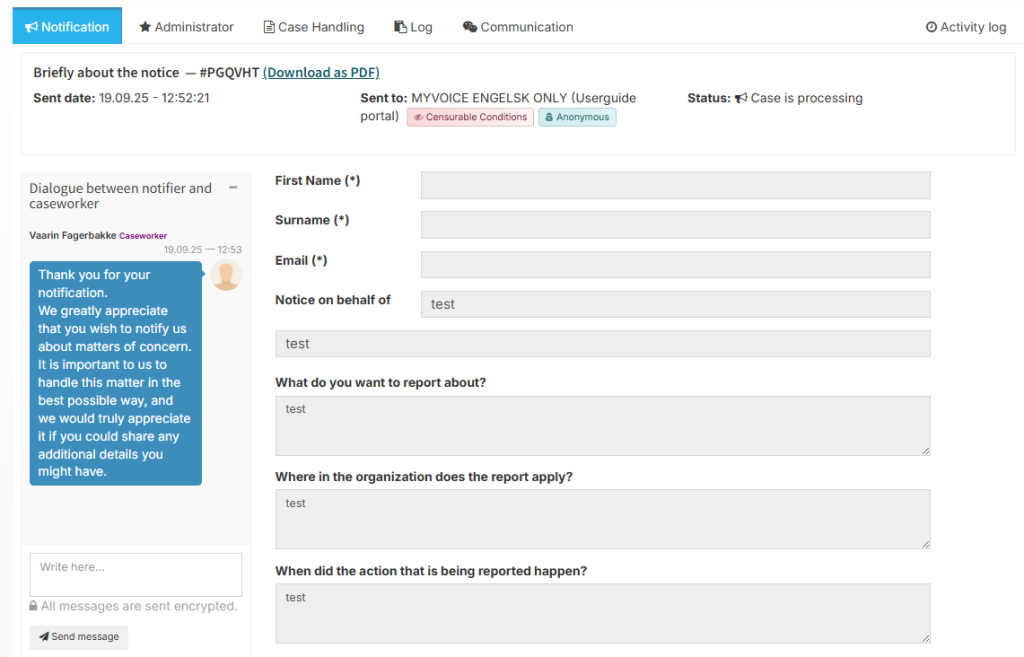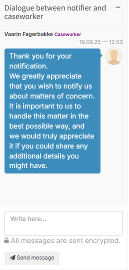 In the dialogue function on the left, you can communicate with the whistle-blower. The whistle-blower will receive an email notifying them that the case handler has sent a message and will be prompted to log in to view it.