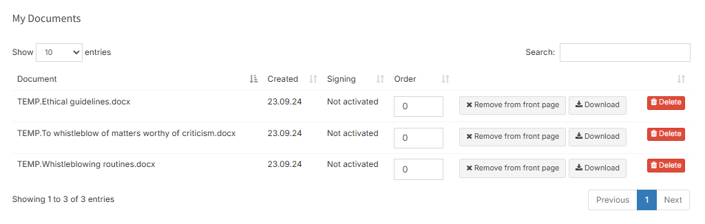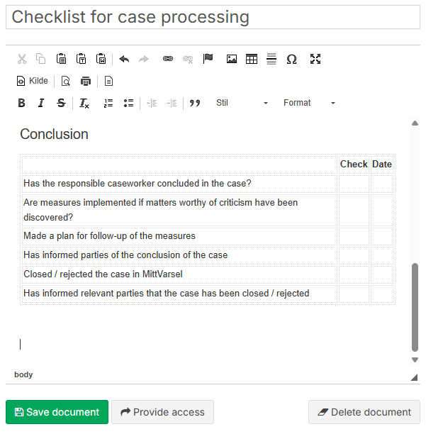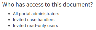 After completing the document, click “Save document”. It becomes visible under “Case documents.” Documents are accessible to co-case handlers, administrators, and any invited read-only users.