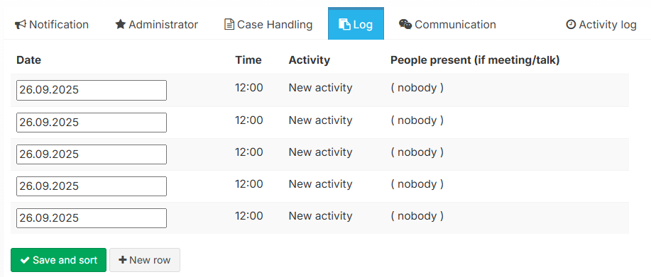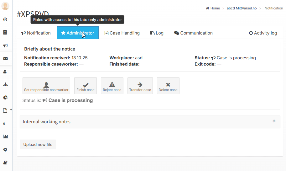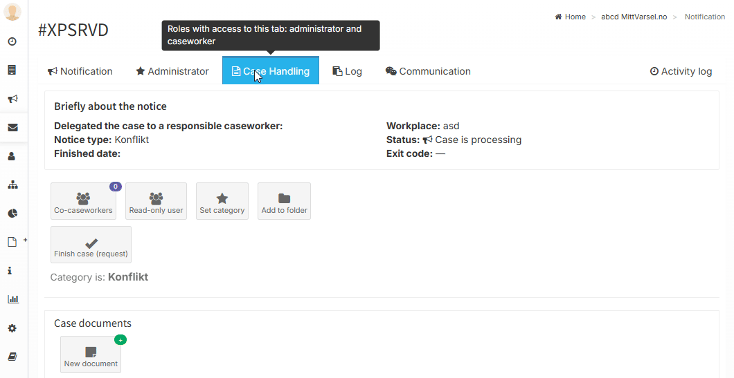 As an administrator and responsible case handler, you have access to five tabs: