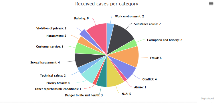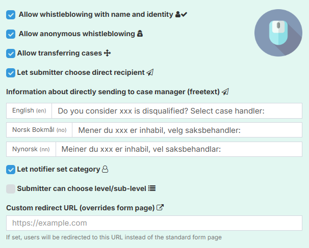 This setting allows the whistle-blower to choose the category of the report. Even when the function is turned on, the case handler can change the category if another is deemed more suitable.