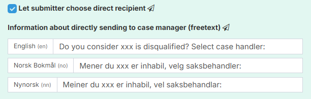 Note that this field only appears in the whistleblowing submission document when the function “Allow sender to choose direct recipient” is enabled.