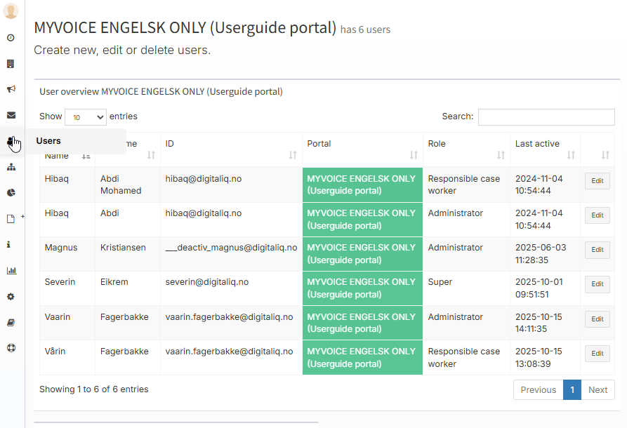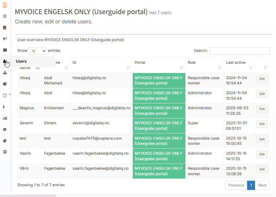 The user overview provides administrators with an easy way to view and manage all registered portal users. Here you can monitor who has access and manage user information and roles. By clicking on “Users” in the menu on the left, you will see the user overview in the portal.