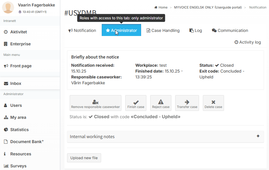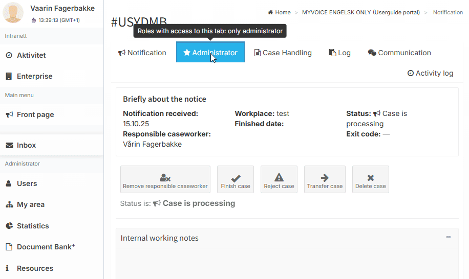 If you, as an administrator, are the only case handler assigned to that particular notification case, even if there are multiple case handlers in the portal, you will see the Administrator tab within the notification, even when logged in as a case handler.