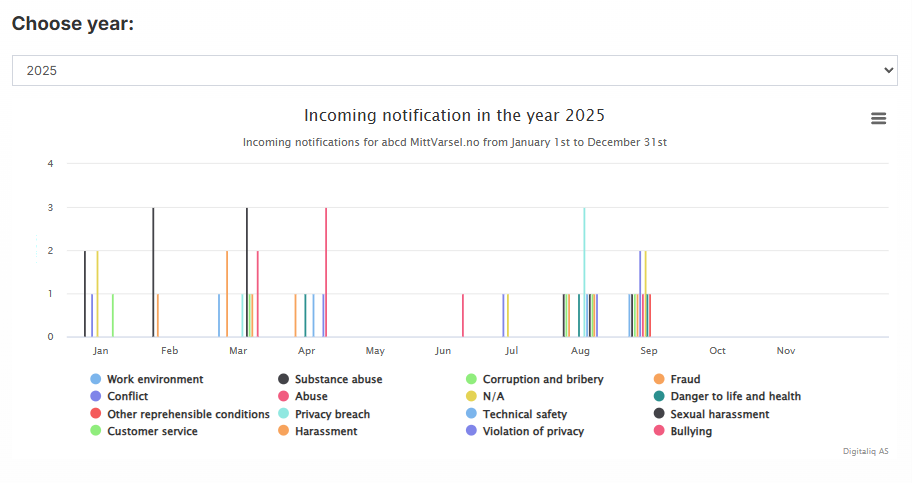 In the notification tab you will find the information the whistle-blower submitted. If they uploaded attachments, these are located at the bottom. The whistle-blower and case handler can upload files by clicking “Upload new file” and selecting relevant files. There are no size or quantity limits, but the file format must be one of: gif, jpg, png, doc, docx, txt. The whistle-blower can see everything uploaded in this section. All text boxes can be resized by clicking and dragging the corner in Chrome, Firefox, and the latest Edge.